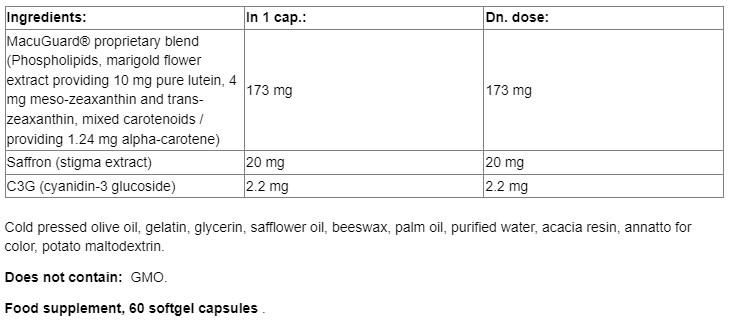 Съставки: Патентована смес от MacuGuard®, екстракт от невен (Tagetes erecta) (цвят) [осигуряващ 10 mg лутеин, 4 mg мезо-зеаксантин и зеаксантин], фосфолипиди, смесени каротеноиди [осигуряващ 1,24 mg α-каротин], екстракт от шафран (стигма)