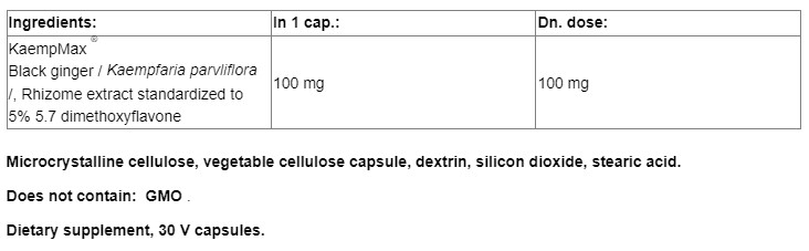Съставки: KaempMax™ екстракт от черен джинджифил (Kaempferia parviflora) (коренище) [станд. до 5% 5,7-диметоксифлавон]