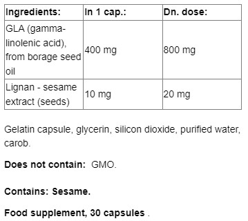 Съставки: Гама-линоленова киселина (GLA) [от масло от пореч (семена)], екстракт от лигнан от сусамово семе