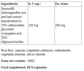 Съставки: Sensoril® Ashwagandha (Withania somnifera) екстракт (корен и листа) [станд. до 10 % витанолидни гликозидни конюгати (12,5 mg) и 32 % олигозахариди (40 mg)]