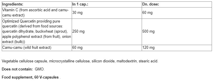 Съставки: Витамин С (от аскорбинова киселина и екстракт от плод каму каму), кверцетин (като кверцетин дихидрат), оптимизирана хранителна смес [биофлавоноиди от цитрус лимонум (плод), ябълка (плод), лук (луковица) (екстракти)], екстракт от каму каму (диворастящ плод)