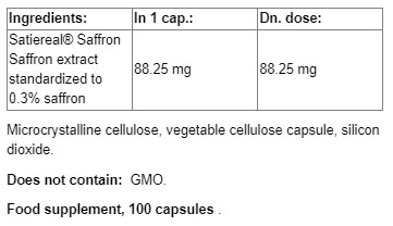 Съставки: Satiereal® Шафран (Crocus sativus L.) екстракт (стигма) [станд. до 0,3% сафранал (0,265 mg)