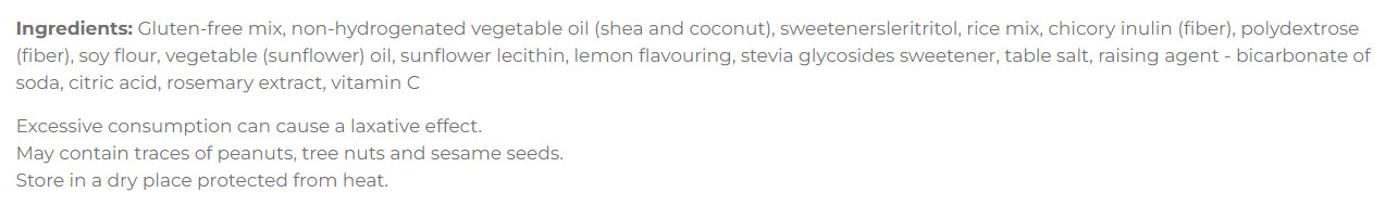 Съставки: Безглутенова смес, нехидрогенирано растително масло (ший и кокос), подсладителсеритритол, оризова смес, инулин от цикория (фибри), полидекстроза (фибри), соево брашно, растително (слънчогледово) масло, слънчогледов лецитин, лимонов аромат, подсладител стевия гликозиди, готварска сол, набухвател - сода бикарбонат, лимонена киселина, екстракт от розмарин, витамин С