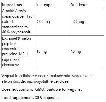 Съставки: Екстракт от Aronia melanocarpa (плод) [станд. до 40% полифеноли], Extramel® концентрат от пулпа от пъпеш (плод) [осигуряващ 140 IU SOD]