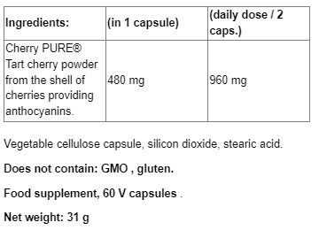 Съставки: CherryPURE® вишна (тръпчива череша) на прах (кожа) [осигуряваща антоцианини]