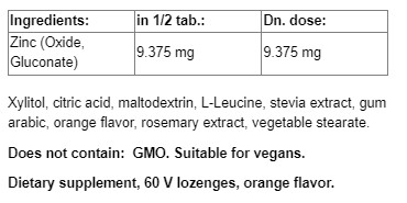 Съставки: Цинк (като цинков ацетат), Други съставки: декстроза, аромат на мента, стеаринова киселина, растителен стеарат, силициев диоксид