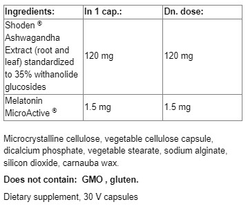 Съставки: Shoden® екстракт от ашваганда (корен и листа) [станд. до 35% витанолидни гликозиди], мелатонин [като MicroActive® мелатонин]