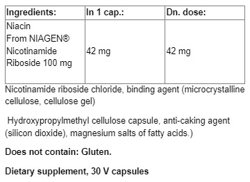 Съставки: Ниацин от NIAGEN® никотинамид рибозид (300 mg)
