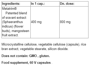 Съставки: Екстракт от цветни глави на бодил от Източна Индия (Sphaeranthus indicus L.), екстракт от кората на мангостан (Garcinia mangostana), капсула (хидроксипропилметилцелулоза), екстракт от оризови трици, антислепващи агенти (магнезиеви соли на мастни киселини, силициев диоксид [нано])
