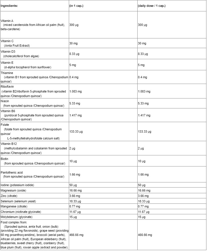 Съставки: Кълнове от киноа (Chenopodium quinoa Willd.), капсула (хидроксипропилметилцелулоза), аскорбинова киселина (витамин С), пълнител (микрокристална целулоза/целулозен гел), екстракт от лук (Allium cepa L.), магнезиев оксид, екстракт от гроздови семки (Vitis vinifera L.) .), прах от плодове от бъз (Sambucus nigra), прах от плодове от къпина (Rubus fruticosus), прах от плодове от боровинки (Vaccinium angustifolium), прах от плодове от череши (Prunus avium), прах от плодове от червена боровинка (Vaccinium oxycoccos), прах от плодове от сини сливи (Prunus domestica) , плодове райска ябълка на прах (Diospyros virginiana), броколи на прах (Brassica oleracea), d-алфа токоферол (витамин Е), обогатени със селен дрожди, смесени каротеноиди, цинков цитрат, антислепващи агенти (силициев диоксид [нано], магнезиеви соли на мастни киселини), холекалциферол (витамин D3), манганов цитрат, бета-каротин, калиев йодид, пиридоксал 5'-фосфат (витамин B6), рибофлавин 5'-фосфат (витамин B2), молибден глицинат хелат, хром никотинат глицинат хелат, калциев- L-метилфолат