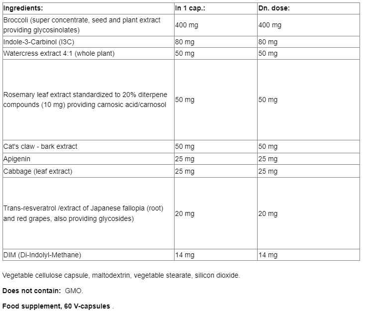Съставки: Екстракт от броколи суперконцентрат (семена и растения) [със съдържание на 4% глюкозинолати (16 mg)], индол-3-карбинол (I3C), екстракт от кресон 4:1 (цяло растение), екстракт от розмарин (листа) [със съдържание на 4% глюкозинолати (16 mg)]. до 20 % дитерпенови съединения (10 mg), осигуряващи карнозна киселина/карнозол], екстракт от котешки нокът (кора), апигенин, екстракт от зеле (лист), транс-ресвератрол [от японско кокиче (корен) и екстракти от гроздови плодове], DIM (3,3'-дииндолилметан)