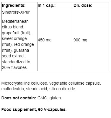 Съставки: Sinetrol-XPur Средиземноморска цитрусова смес (съдържаща екстракти от грейпфрут (плод), сладък портокал (плод), червен портокал (плод) и гуарана (семена) [станд. до 20% общо флаванони]