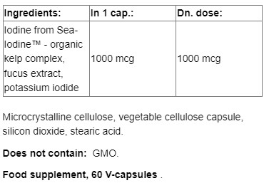 Съставки: Йод [от Sea-Iodine™ Complex Blend (органични екстракти от водорасли и мехур, калиев йодид)]
