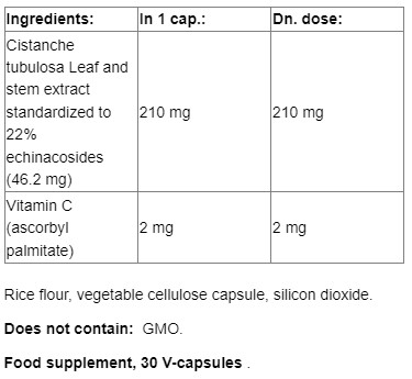 Съставки: Витамин C (като аскорбил палмитат), екстракт от Cistanche tubulosa (стъбло и листа) [станд. до 22% ехинакозиди (46,2 mg)]