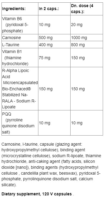 Съставки: Витамин B6 (като пиридоксал 5'-фосфат), натрий, карнозин, L-таурин, бенфотиамин, R-липоева киселина (като микрокапсулиран био-подсилен стабилизиран Na-RALA натриев R-липоат), PQQ (пиролохинолин хинон) динатриева сол, лутеолин [от екстракт от портокал (плод)]