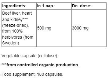 Съставки (в една доза): Орган от шведско говеждо месо, хранено с трева (устойчиво), около 2700 mg: Черен дроб: 900 mg , Бъбреци: 900 mg, Сърце: 900 mg