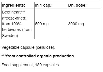 Съставки (в една доза): Сърце от шведско говеждо месо, хранено с трева (устойчиво), около 2700 mg