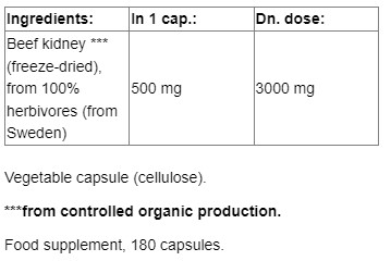 Съставки (в една доза): Бъбрек от шведско говеждо месо, хранено с трева (устойчиво), около 3000 mg