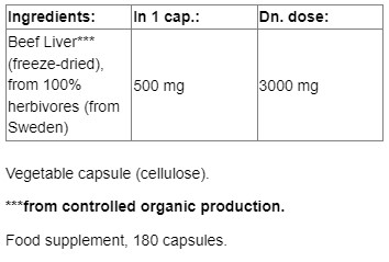 Съставки (в една доза): Черен дроб от шведско говеждо месо, хранено с трева (устойчиво), около 3000 mg