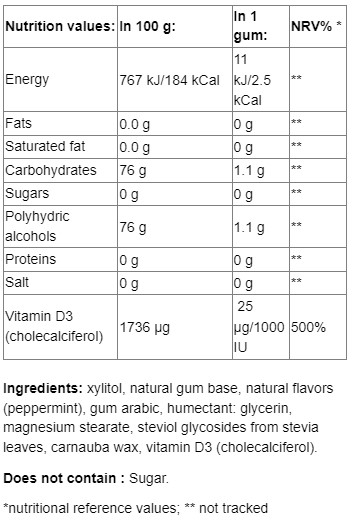 Съставки: подсладител: ксилитол; натурална дъвкателна маса (от чикъл дърво "манилкара сапота"), натурални аромати (мента), сгъстител: гума арабика; овлажнител: глицерол; антислепващ агент: магнезиев стеарат; подсладител: стевиол гликозиди от листата на Stevia Rebaudiana, глазиращ агент: карнаубски восък, витамин D3 (холекалциферол)