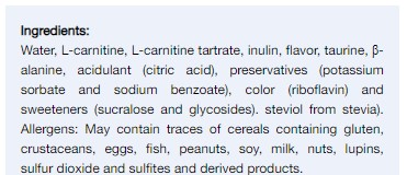 Съставки: вода, L–карнитин, L-карнитин тартарат, подсладител (сукралоза), консервант (калиев сорбат)