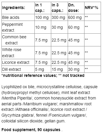 Съставки: Жлъчни киселини, Мента екстракт, Обикновен пчелинок, Бяла ружа екстракт, Женско биле екстракт, Копър екстракт, Лиофилизирана волска жлъчка, микрокристална целулоза, капсула (хидроксипропил метил целулоза), мента екстракт от лист /Mentha Piperita/, обикновен пчелинок екстракт от надземни части /Marribium vulgare/, бяла ружа екстракт от корен /Althaea officinalis/, женско биле екстракт от корен /Glycyrhiza glabra/, копър /Foeniculum vulgare/, колоиден силициев диоксид, гума гелан
