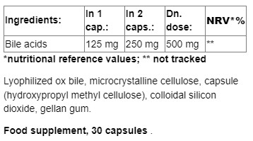 Съставки: Жлъчни киселини: Лиофилизирана волска жлъчка, микрокристална целулоза, капсула (хидроксипропил метил целулоза), колоиден силициев диоксид, гума гелан