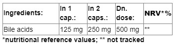 Съставки: Жлъчни киселини: Лиофилизирана волска жлъчка, микрокристална целулоза, капсула (хидроксипропил метил целулоза), колоиден силициев диоксид, гума гелан