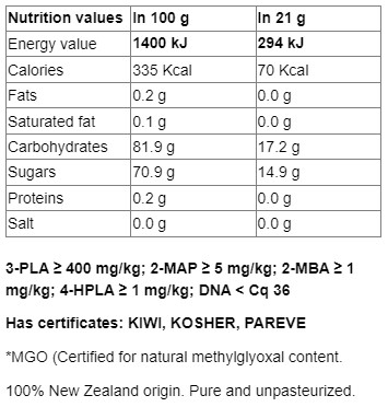 Съставки: мед от манука, сертифициран от правителството на Нова Зеландия, отгледан и произведен в Нова Зеландия
