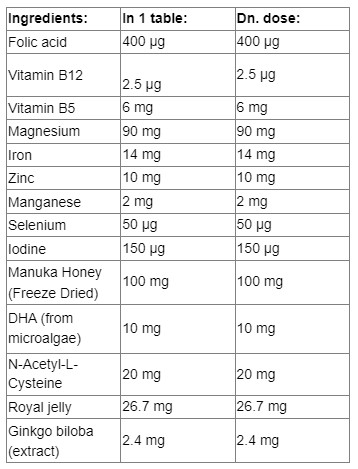 Съставки: Фолиева киселина, Витамин В12, Витамин В5, Магнезий, Желязо, Цинк, Манган, Селен, Йод, Мед от манука (изсушен чрез замразяване), DHA (от микроводорасли), Н-Ацетил-Л-Цистеин, Пчелно млечице, Гинко билоба (екстракт)