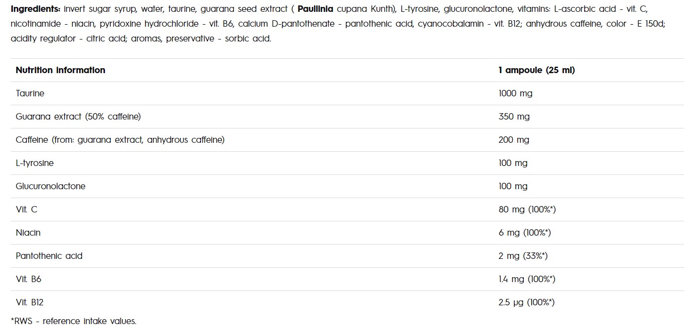 Съставки: сироп от инвертна захар, вода, таурин, екстракт от семена на гуарана (Paullinia cupana Kunth), L-тирозин, глюкуронолактон, витамини (L-аскорбинова киселина - вит. С, никотинамид - ниацин, пиридоксин хидрохлорид - вит. В6, калциев D-пантотенат - пантотенова киселина, цианокобаламин - вит. В12), безводен кофеин, оцветител; регулатор на киселинността - лимонена киселина; ароматизанти, консерванти