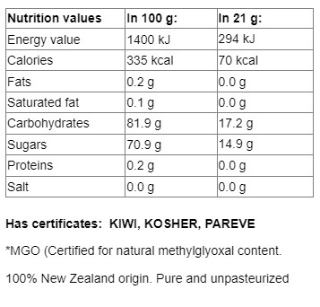 Съставки: мед от манука, сертифициран от правителството на Нова Зеландия, отгледан и произведен в Нова Зеландия