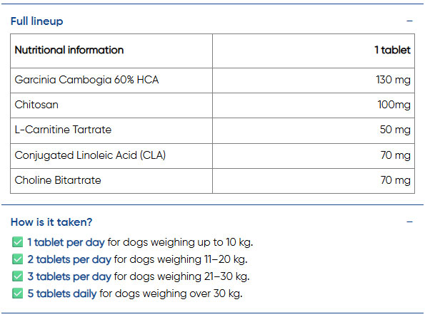 Weight & Appetite Control от Paw2Paw е продукт подходящ за всякакви породи кучета със специално разработена формула за намаляване на теглото на кучето, апетита и превенция за кучета, предпазположени към напълняване. Подбрания състав, състоящ се от Гарсиния Камбоджа, Хитозан, Холин, Л-Карнитин и Линова киселина, ефективно регулира апетита, подпомага функцията на черния дроб и стимулира метаболизма на кучето, като едновременно с това е безопасен и не причинява странични ефекти.