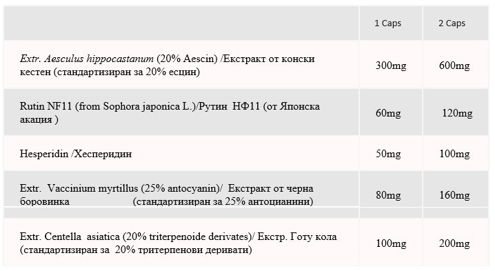 Съставки: Екстракт от конски кестен (стандартизиран за 20% есцин), Рутин НФ11 (от Японска акация), Екстракт от черна боровинка (стандартизиран за 25% антоцианини), Eкстр. Готу кола (стандартизиран за 20% тритерпенови деривати)