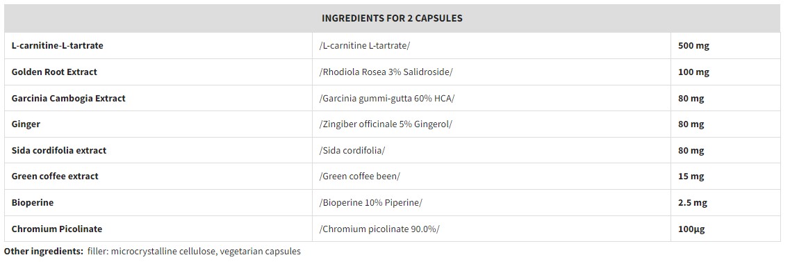 Съставки: Л-карнитин –Л-тартарат /L-carnitine L-tartrate/, Златен Корен /Rhodiola Rosea 3% Salidroside/, Гарциния Камбоджа /Garcinia gummi-gutta 60% HCA/, Джинджифил /Zingiber officinale 5% Gingerol/, Сида Кордифолия /Sida cordifolia/, Зелено кафе /Green coffee вean – Coffea arabica L/, Биоперин /Bioperine 10% Piperine/, Хром Пиколинат /Chromium picolinate 90.0%/