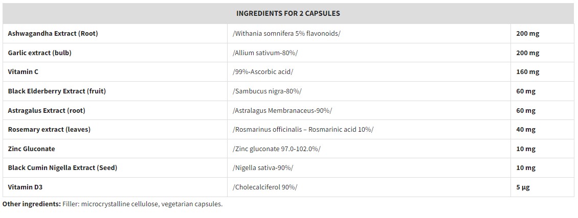 Съставки: Екстракт от Ашваганда /Withania somnifera 5% flavonoids/, Екстракт от Чесън/Allium sativum-80%/, Аскорбинова киселина (Витамин C)/99%-Ascorbic acid/, Екстракт от Черен бъз/Sambucus nigra-80%/, Екстракт от Астрагал/Astragalus Membranaceus-90%/, Есктракт Розмарин /Rosmarinus officinalis -Rosmarinic acid 10%/, Цинк глюконат/Zinc gluconate 97.0-102.0%/, Черен кимион/Nigella sativa-90%/, Витамин D3/Cholecalciferol 90%/