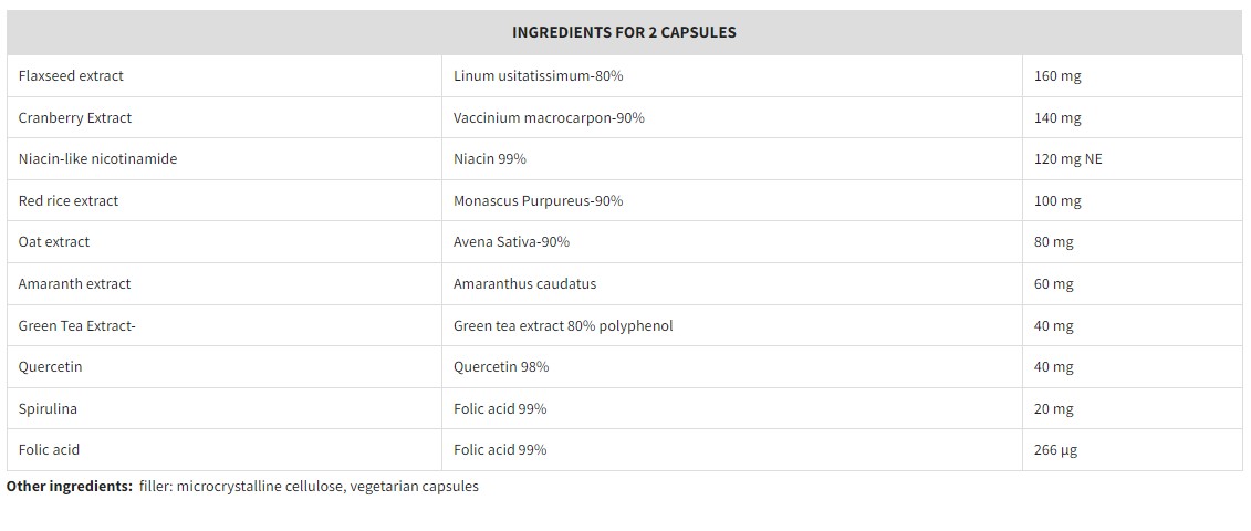 Съставки: Екстракт от Ленено семе/Linum usitatissimum-80%/, Екстракт от Червена Боровинка/Vaccinium macrocarpon-90%/, Витамин В3 – Ниацин /Niacin 99%/, Екстракт от Червен ориз/Monascus Purpureus-90%/, Екстракт от Овес/Avena Sativa-90%/, Екстракт от Амарант/Amaranthus mangostanus/, Екстракт от Зелен чай /Green тea еxtract 80% polyphenol/, Кверцетин /Quercetin 98%/, Спирулина, Фолиева киселина – Витамин B9 /Folic acid 99%/