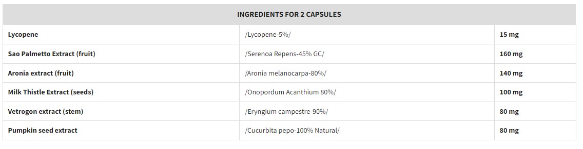 Съставки: Ликопен /Lycopene-5%/, Екстракт Сао Палмето /Serenoa Repens-45% GC/, Екстракт от Арония /Aronia melanocarpa-80%/, Екстракт Магарешки бодил/Onopordum Acanthium 80%/, Екстракт Ветрогон/Биволски трън /Eryngium campestre-90% /, Екстракт от Тиквени семки/ Cucurbita pepo-100% Natural/