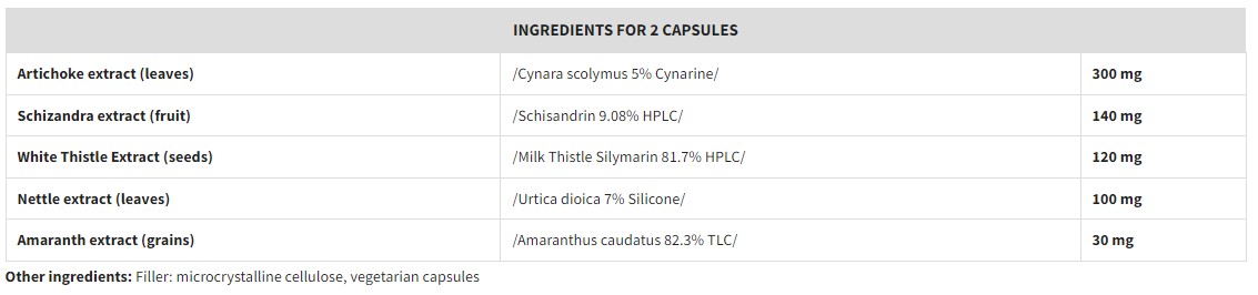 Съставки: Артишок /5% Сynarine/, Шизандра /Schisandrin 9%/, Бял Трън /Silymarin 80%/, Kоприва /Urtica dioica 7% Silicone/ и Амарант