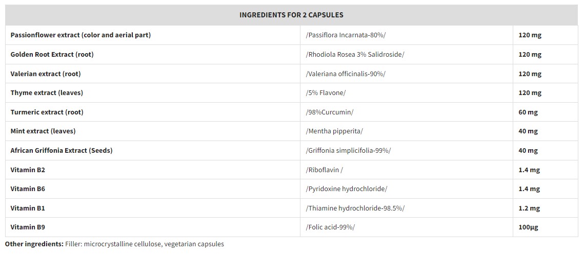 Съставки: Екстракт Пасифлора (цвят и въздушна част), Екстракт Златен Корен (корен), Екстракт Валериана (корен), Екстракт Мащерка (листа), Eкстракт Куркума (корен), Eкстракт Мента (листа), Екстрат Африканска Грифония (семена), Витамин В2, Витамин В6, Витамин В1, Витамин В9