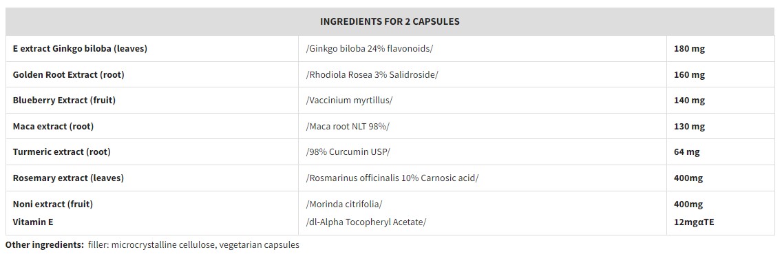 Съставки: Екстракт от Гинко билоба /Ginkgo biloba 24% flavonoids/, Екстракт от Златен Корен /Rhodiola Rosea 3% Salidroside/, Екстракт от Синя боровинка, Екстракт от Корен Мака /Maca root/, Екстракт от Куркума /98% Curcumin/, Есктракт Розмарин /Rosmarinus officinalis 10% Carnosic acid/, Екстракт от Нони /Morinda citrifolia/, Витамин Е /Tокоферо̀л/