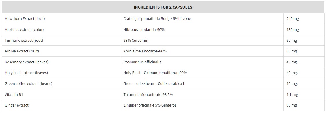 Съставки: Екстракт от Глог/Crataegus pinnatifida Bunge-5%flavon/, Екстракт от Хибискус /Hibiscus sabdariffa-90%/, Екстракт от Куркума /98%Curcumin/, Екстракт от Арония/Aronia melanocarpa-80%/, Есктракт Розмарин/Rosmarinus officinalis/, Екстракт от Свещен босилек/Holy Basil – Ocimum tenuiflorum90%/, Екстракт от Зелено кафе/Green coffee вean – Coffea arabica L/, Витамин В1/Тиамин/Thiamine Mononitrate-98.5%/, Екстракт от Джинджифил /Zingiber officinale 5% Gingerol/