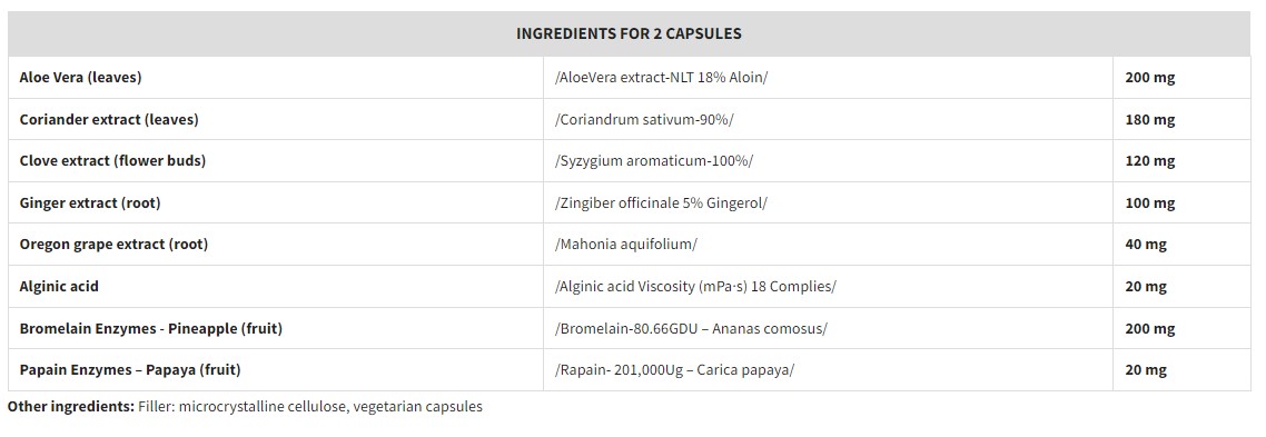 Съставки: алое вера (листа) 200 mg, eкстракт от кориандър (листа) 180 mg, eкстракт от карамфил (цветни пъпки) 120 mg, екстракт от джинджифил (корен) 100 mg, екстракт от орегонско грозде (корен) 40 mg, алгинова киселина 20 mg, бромелаин – ананас (плод) 200 mg, папаин – папая (плод) 20 mg