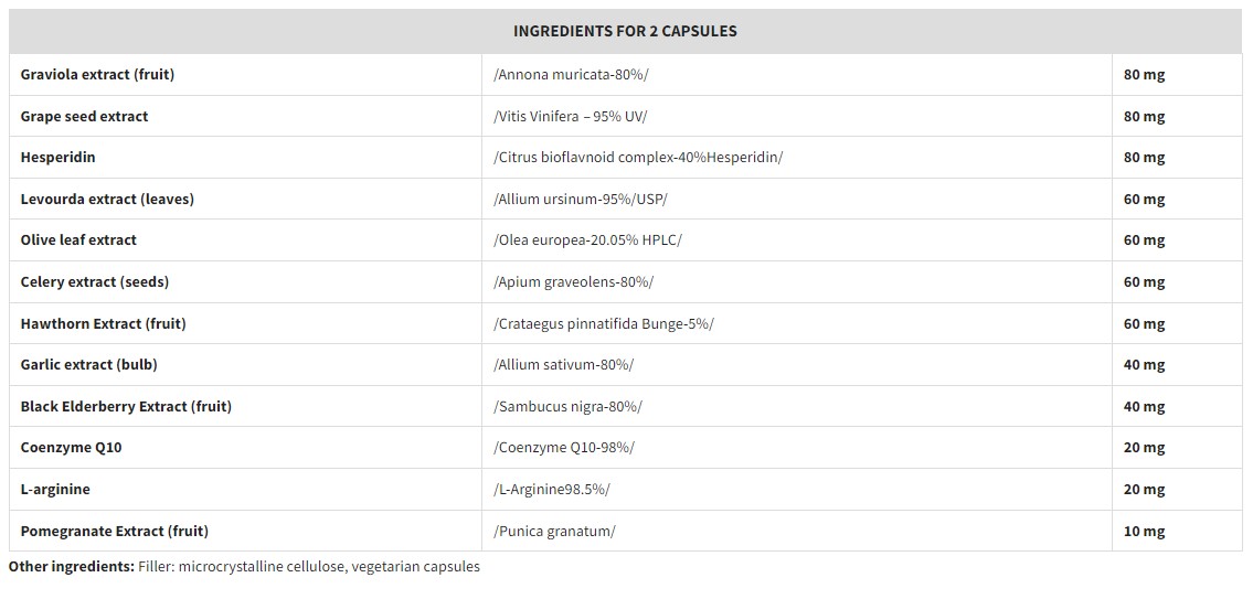 Съставки: Екстракт от Гравиола, Екстракт от Гроздови семена, Хесперидин, Екстракт от Левурда, Екстракт от Маслинови листа, Екстракт от Целина, Екстракт от Глог, Екстракт от Чесън, Екстракт от Черен Бъз, Коензим Q10, L-аргинин, Екстракт от Нар