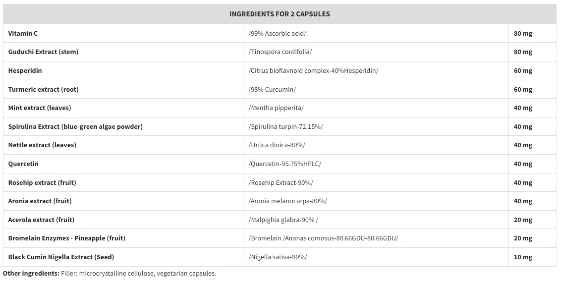 Съставки: Витамин С /99% Ascorbic acid/, Гудучи/Tinospora cordifolia/, Хесперидин /Citrus bioflavnoid complex-40%Hesperidin/, Куркума/98%Curcumin/, Мента/Mentha pipperita/, Спирулина/Spirulina turpin-72.15%/, Коприва/Urtica dioica-80%/, Квeрцетин/Quercetin-95.75%HPLC/, Шипка/Rosehip Еxtract-90%/, Арония/Aronia melanocarpa-80%/, Ацерола/Malpighia glabra-90%/, Бромелайн ензимиBromelain /Ananas comosus-80.66GDU/, и Черен кимион Нигела/Nigella sativa-90%/