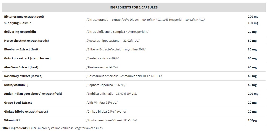 Съставки: Екстракт Горчив портокал (кора), Екстракт Див кестен (семена), Екстракт Синя боровинка (плод), Екстракт Готу кола (стебло: листа), Екстракт Алое вера (листа), Екстракт Розмарин (листа), Рутин, Екстракт Амла (Индийско цариградско грозде) (плод), Екстракт от Гроздови семена, Екстракт Гинкго билоба (листа), Витамин К1