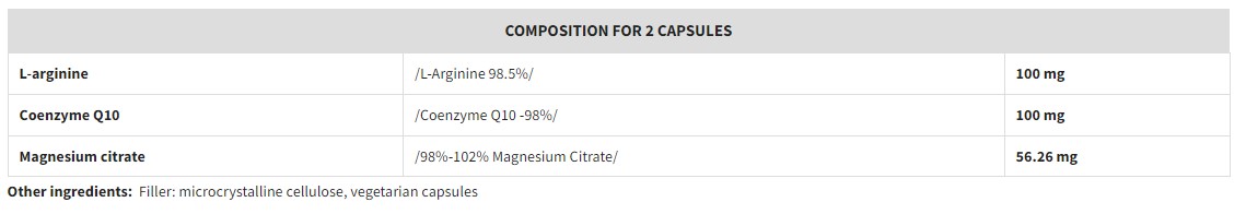 Съставки: L-Аргинин /L– Arginine 98,5%/, Коензим Q10 /Coenzyme Q 10 -98%/, Магнезиев цитрат /98%-102% Magnesium Citrate/