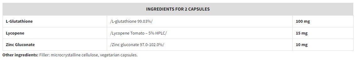 Съставки:Л-Глутатион/ L-glutathione98.0% /, Ликопен/ Lycopene – 5% / и Цинк Глюконат /Zinc gluconate 97.0-102.0%/