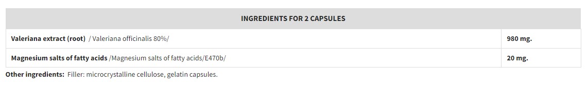 Съставки: екстракт валериана (корен) / valeriana officinalis 80%/ 980 mg., магнезиеви соли на мастни киселини /magnesium salts of fatty acids 20 mg., Други съставки: пълнител: микрокристална целулоза, желатинови капсули