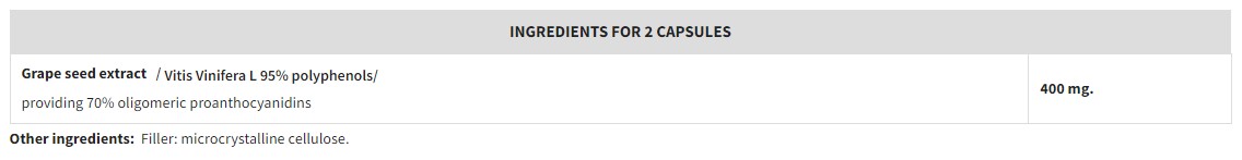 Съставки: Екстракт Гроздови семена / Vitis Vinifera L 95% polyphenols/, осигуряващи 70% олигомерни проантоцианидини